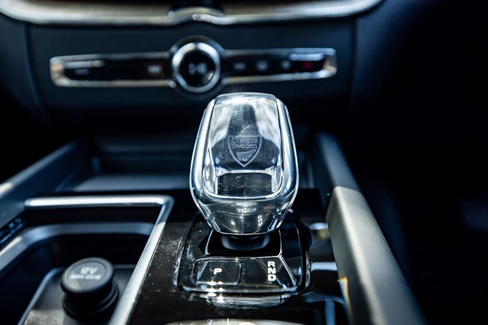 Cabin practicality wins include a wireless phone charging pad in front of the crystal Orrefors gear selector, and a cupholder section with a sliding wood panel to cover it up if you prefer. The wood panelling continues up onto the dash and looks great, and there are other choices if you prefer a different design and texture.