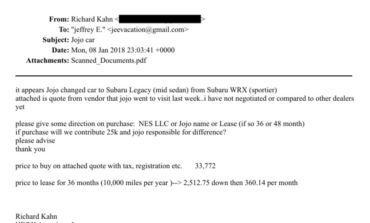In the end, it seems that Fontanilla went down a slightly different route, opting for something a little larger and more relaxed than the WRX, but sticking with Subaru. A second round of emails from January 2018 show that a Subaru Legacy had been tracked down at another New York Subaru dealer, with Kahn proposing that he and Epstein contribute $25,000 and that Fontanilla provide the remainder towards the $33,772 out-of-the-door price. It’s unclear if this deal ended up going through, as the trail appears to end there.